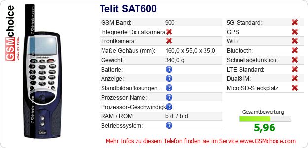 Hast du eigene Webseite? Willst du die Informationen über Standarddaten des Handys Telit SAT600 irgendwo veröffentlichen? Das ist sehr einfach. Du kannst das Bild herunterladen oder kopieren und auf der Webseite folgenden Code hinzufügen:Das Einfügen von diesem Code verursacht das Anzeigen von dem folgenden Bild: