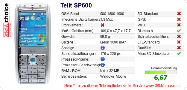 Hast du eigene Webseite? Willst du die Informationen über Standarddaten des Handys Telit SP600 irgendwo veröffentlichen? Das ist sehr einfach. Du kannst das Bild herunterladen oder kopieren und auf der Webseite folgenden Code hinzufügen:Das Einfügen von diesem Code verursacht das Anzeigen von dem folgenden Bild: