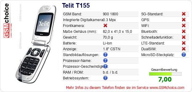 Hast du eigene Webseite? Willst du die Informationen über Standarddaten des Handys Telit T155 irgendwo veröffentlichen? Das ist sehr einfach. Du kannst das Bild herunterladen oder kopieren und auf der Webseite folgenden Code hinzufügen:Das Einfügen von diesem Code verursacht das Anzeigen von dem folgenden Bild: