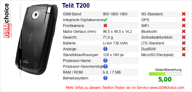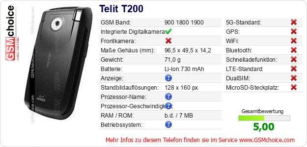 Hast du eigene Webseite? Willst du die Informationen über Standarddaten des Handys Telit T200 irgendwo veröffentlichen? Das ist sehr einfach. Du kannst das Bild herunterladen oder kopieren und auf der Webseite folgenden Code hinzufügen:Das Einfügen von diesem Code verursacht das Anzeigen von dem folgenden Bild: