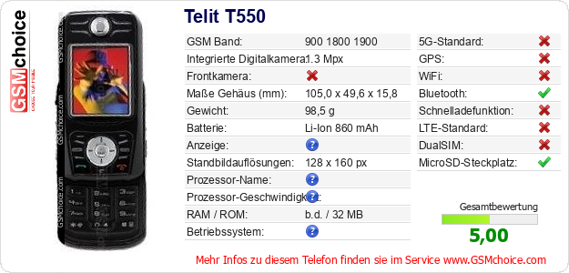 Hast du eigene Webseite? Willst du die Informationen über Standarddaten des Handys Telit T550 irgendwo veröffentlichen? Das ist sehr einfach. Du kannst das Bild herunterladen oder kopieren und auf der Webseite folgenden Code hinzufügen:Das Einfügen von diesem Code verursacht das Anzeigen von dem folgenden Bild: