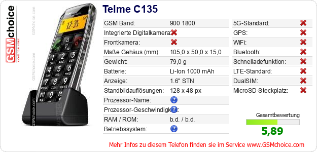 Hast du eigene Webseite? Willst du die Informationen über Standarddaten des Handys Telme C135 irgendwo veröffentlichen? Das ist sehr einfach. Du kannst das Bild herunterladen oder kopieren und auf der Webseite folgenden Code hinzufügen:Das Einfügen von diesem Code verursacht das Anzeigen von dem folgenden Bild:
