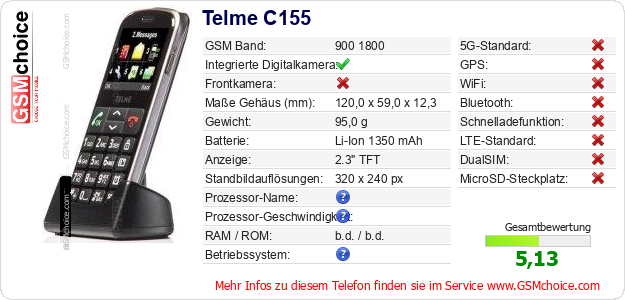 Hast du eigene Webseite? Willst du die Informationen über Standarddaten des Handys Telme C155 irgendwo veröffentlichen? Das ist sehr einfach. Du kannst das Bild herunterladen oder kopieren und auf der Webseite folgenden Code hinzufügen:Das Einfügen von diesem Code verursacht das Anzeigen von dem folgenden Bild:
