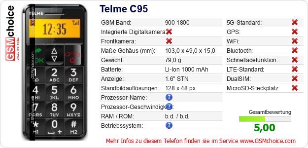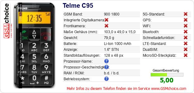 Hast du eigene Webseite? Willst du die Informationen über Standarddaten des Handys Telme C95 irgendwo veröffentlichen? Das ist sehr einfach. Du kannst das Bild herunterladen oder kopieren und auf der Webseite folgenden Code hinzufügen:Das Einfügen von diesem Code verursacht das Anzeigen von dem folgenden Bild: