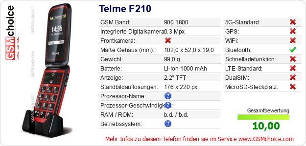 Hast du eigene Webseite? Willst du die Informationen über Standarddaten des Handys Telme F210 irgendwo veröffentlichen? Das ist sehr einfach. Du kannst das Bild herunterladen oder kopieren und auf der Webseite folgenden Code hinzufügen:Das Einfügen von diesem Code verursacht das Anzeigen von dem folgenden Bild:
