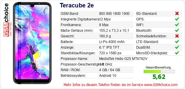 Hast du eigene Webseite? Willst du die Informationen über Standarddaten des Handys Teracube 2e irgendwo veröffentlichen? Das ist sehr einfach. Du kannst das Bild herunterladen oder kopieren und auf der Webseite folgenden Code hinzufügen:Das Einfügen von diesem Code verursacht das Anzeigen von dem folgenden Bild: