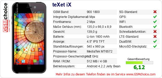 Hast du eigene Webseite? Willst du die Informationen über Standarddaten des Handys teXet iX irgendwo veröffentlichen? Das ist sehr einfach. Du kannst das Bild herunterladen oder kopieren und auf der Webseite folgenden Code hinzufügen:Das Einfügen von diesem Code verursacht das Anzeigen von dem folgenden Bild: