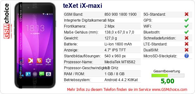 Hast du eigene Webseite? Willst du die Informationen über Standarddaten des Handys teXet iX-maxi irgendwo veröffentlichen? Das ist sehr einfach. Du kannst das Bild herunterladen oder kopieren und auf der Webseite folgenden Code hinzufügen:Das Einfügen von diesem Code verursacht das Anzeigen von dem folgenden Bild: