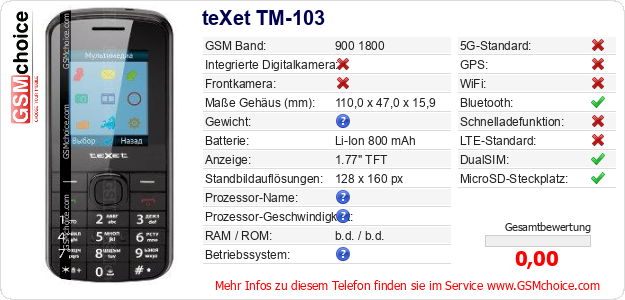 Daten des Mobiltelefons teXet TM-103 auf Ihrer Seite