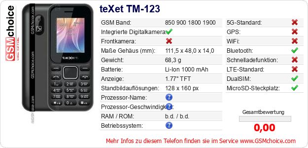 Daten des Mobiltelefons teXet TM-123 auf Ihrer Seite
