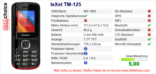 Hast du eigene Webseite? Willst du die Informationen über Standarddaten des Handys teXet TM-125 irgendwo veröffentlichen? Das ist sehr einfach. Du kannst das Bild herunterladen oder kopieren und auf der Webseite folgenden Code hinzufügen:Das Einfügen von diesem Code verursacht das Anzeigen von dem folgenden Bild:
