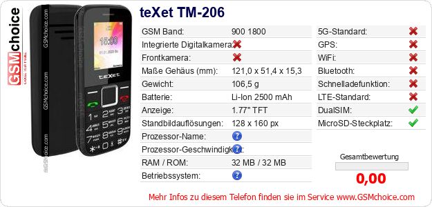 Hast du eigene Webseite? Willst du die Informationen über Standarddaten des Handys teXet TM-206 irgendwo veröffentlichen? Das ist sehr einfach. Du kannst das Bild herunterladen oder kopieren und auf der Webseite folgenden Code hinzufügen:Das Einfügen von diesem Code verursacht das Anzeigen von dem folgenden Bild: