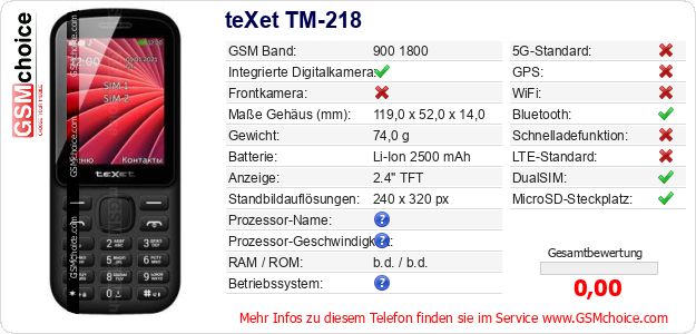Hast du eigene Webseite? Willst du die Informationen über Standarddaten des Handys teXet TM-218 irgendwo veröffentlichen? Das ist sehr einfach. Du kannst das Bild herunterladen oder kopieren und auf der Webseite folgenden Code hinzufügen:Das Einfügen von diesem Code verursacht das Anzeigen von dem folgenden Bild: