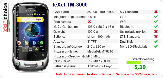 Hast du eigene Webseite? Willst du die Informationen über Standarddaten des Handys teXet TM-3000 irgendwo veröffentlichen? Das ist sehr einfach. Du kannst das Bild herunterladen oder kopieren und auf der Webseite folgenden Code hinzufügen:Das Einfügen von diesem Code verursacht das Anzeigen von dem folgenden Bild: