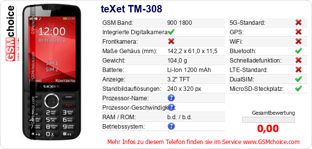 Daten des Mobiltelefons teXet TM-308 auf Ihrer Seite