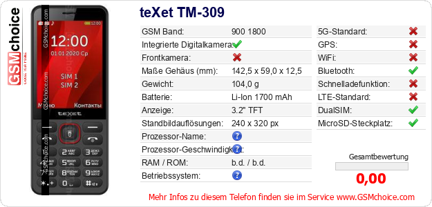 Daten des Mobiltelefons teXet TM-309 auf Ihrer Seite