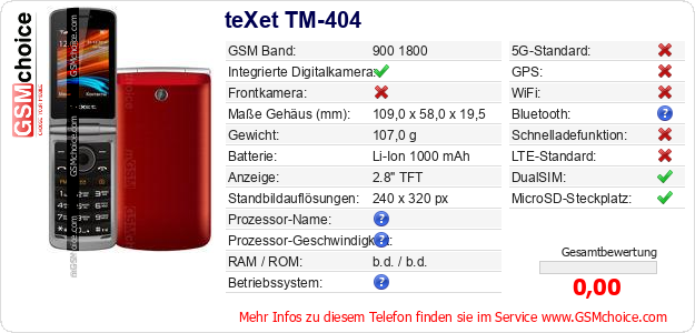 Daten des Mobiltelefons teXet TM-404 auf Ihrer Seite