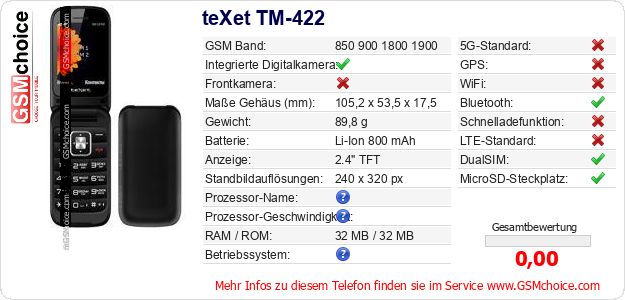 Hast du eigene Webseite? Willst du die Informationen über Standarddaten des Handys teXet TM-422 irgendwo veröffentlichen? Das ist sehr einfach. Du kannst das Bild herunterladen oder kopieren und auf der Webseite folgenden Code hinzufügen:Das Einfügen von diesem Code verursacht das Anzeigen von dem folgenden Bild: