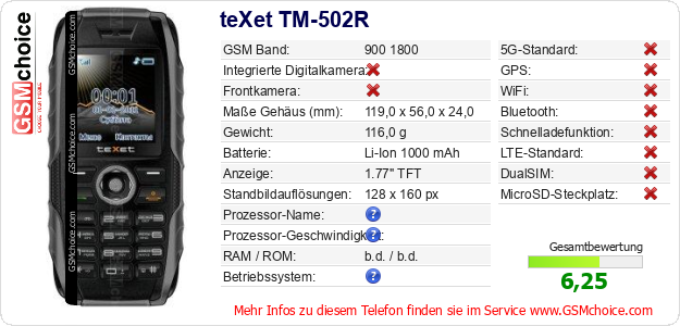 Daten des Mobiltelefons teXet TM-502R auf Ihrer Seite