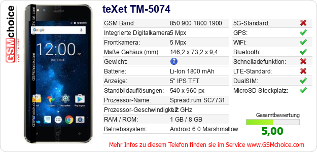 Daten des Mobiltelefons teXet TM-5074 auf Ihrer Seite