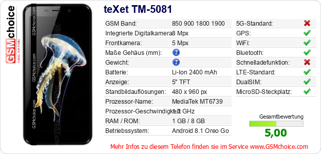 Hast du eigene Webseite? Willst du die Informationen über Standarddaten des Handys teXet TM-5081 irgendwo veröffentlichen? Das ist sehr einfach. Du kannst das Bild herunterladen oder kopieren und auf der Webseite folgenden Code hinzufügen:Das Einfügen von diesem Code verursacht das Anzeigen von dem folgenden Bild: