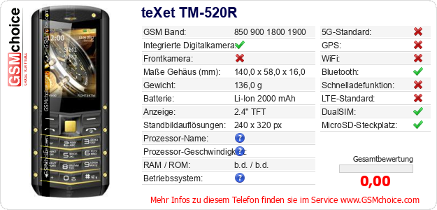 Daten des Mobiltelefons teXet TM-520R auf Ihrer Seite