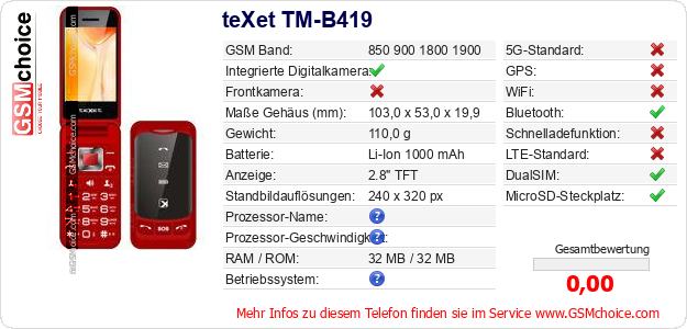 Hast du eigene Webseite? Willst du die Informationen über Standarddaten des Handys teXet TM-B419 irgendwo veröffentlichen? Das ist sehr einfach. Du kannst das Bild herunterladen oder kopieren und auf der Webseite folgenden Code hinzufügen:Das Einfügen von diesem Code verursacht das Anzeigen von dem folgenden Bild: