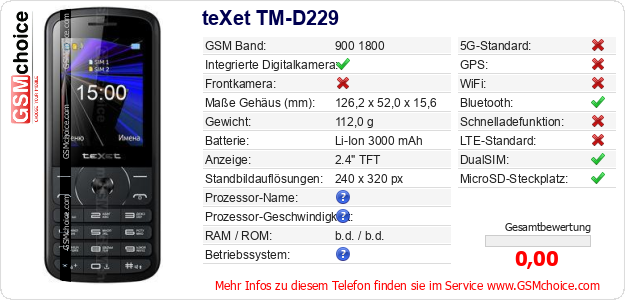 Hast du eigene Webseite? Willst du die Informationen über Standarddaten des Handys teXet TM-D229 irgendwo veröffentlichen? Das ist sehr einfach. Du kannst das Bild herunterladen oder kopieren und auf der Webseite folgenden Code hinzufügen:Das Einfügen von diesem Code verursacht das Anzeigen von dem folgenden Bild: