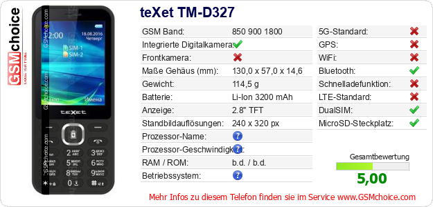 Hast du eigene Webseite? Willst du die Informationen über Standarddaten des Handys teXet TM-D327 irgendwo veröffentlichen? Das ist sehr einfach. Du kannst das Bild herunterladen oder kopieren und auf der Webseite folgenden Code hinzufügen:Das Einfügen von diesem Code verursacht das Anzeigen von dem folgenden Bild: