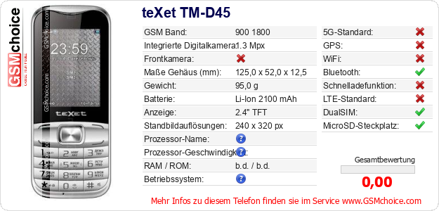 Daten des Mobiltelefons teXet TM-D45 auf Ihrer Seite