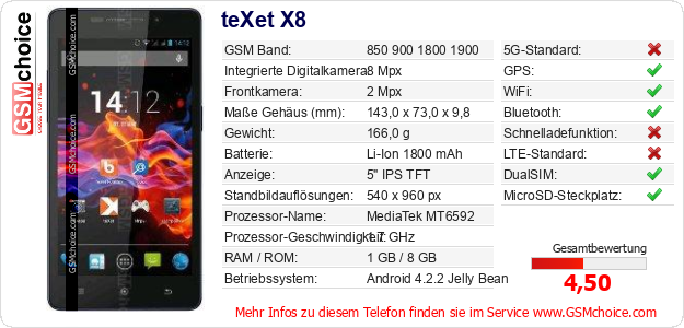 Hast du eigene Webseite? Willst du die Informationen über Standarddaten des Handys teXet X8 irgendwo veröffentlichen? Das ist sehr einfach. Du kannst das Bild herunterladen oder kopieren und auf der Webseite folgenden Code hinzufügen:Das Einfügen von diesem Code verursacht das Anzeigen von dem folgenden Bild: