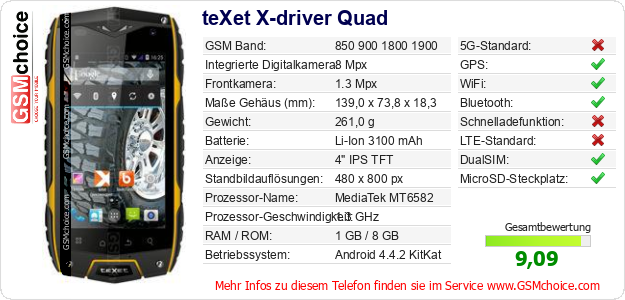 Hast du eigene Webseite? Willst du die Informationen über Standarddaten des Handys teXet X-driver Quad irgendwo veröffentlichen? Das ist sehr einfach. Du kannst das Bild herunterladen oder kopieren und auf der Webseite folgenden Code hinzufügen:Das Einfügen von diesem Code verursacht das Anzeigen von dem folgenden Bild: