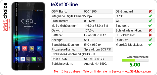 Hast du eigene Webseite? Willst du die Informationen über Standarddaten des Handys teXet X-line irgendwo veröffentlichen? Das ist sehr einfach. Du kannst das Bild herunterladen oder kopieren und auf der Webseite folgenden Code hinzufügen:Das Einfügen von diesem Code verursacht das Anzeigen von dem folgenden Bild: