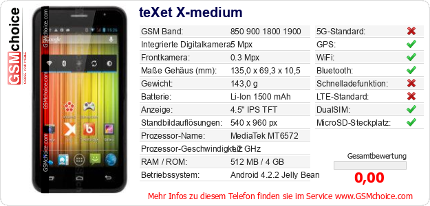 Hast du eigene Webseite? Willst du die Informationen über Standarddaten des Handys teXet X-medium irgendwo veröffentlichen? Das ist sehr einfach. Du kannst das Bild herunterladen oder kopieren und auf der Webseite folgenden Code hinzufügen:Das Einfügen von diesem Code verursacht das Anzeigen von dem folgenden Bild:
