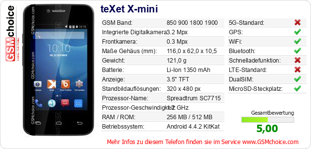 Hast du eigene Webseite? Willst du die Informationen über Standarddaten des Handys teXet X-mini irgendwo veröffentlichen? Das ist sehr einfach. Du kannst das Bild herunterladen oder kopieren und auf der Webseite folgenden Code hinzufügen:Das Einfügen von diesem Code verursacht das Anzeigen von dem folgenden Bild: