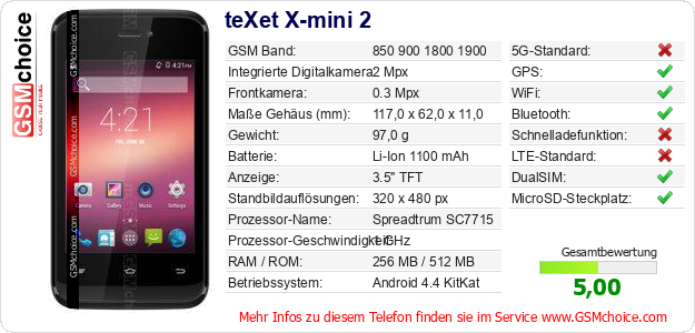 Hast du eigene Webseite? Willst du die Informationen über Standarddaten des Handys teXet X-mini 2 irgendwo veröffentlichen? Das ist sehr einfach. Du kannst das Bild herunterladen oder kopieren und auf der Webseite folgenden Code hinzufügen:Das Einfügen von diesem Code verursacht das Anzeigen von dem folgenden Bild: