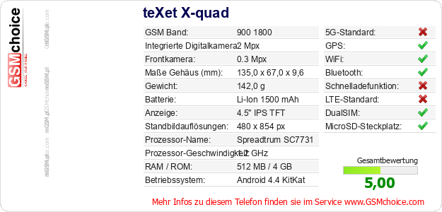 Hast du eigene Webseite? Willst du die Informationen über Standarddaten des Handys teXet X-quad irgendwo veröffentlichen? Das ist sehr einfach. Du kannst das Bild herunterladen oder kopieren und auf der Webseite folgenden Code hinzufügen:Das Einfügen von diesem Code verursacht das Anzeigen von dem folgenden Bild: