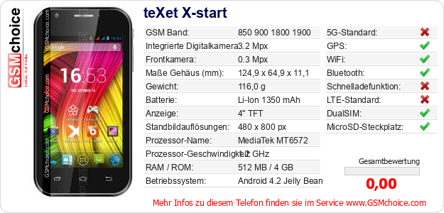 Hast du eigene Webseite? Willst du die Informationen über Standarddaten des Handys teXet X-start irgendwo veröffentlichen? Das ist sehr einfach. Du kannst das Bild herunterladen oder kopieren und auf der Webseite folgenden Code hinzufügen:Das Einfügen von diesem Code verursacht das Anzeigen von dem folgenden Bild: