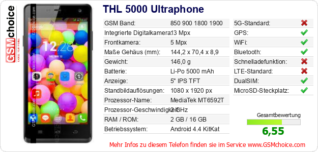 Hast du eigene Webseite? Willst du die Informationen über Standarddaten des Handys THL 5000 Ultraphone irgendwo veröffentlichen? Das ist sehr einfach. Du kannst das Bild herunterladen oder kopieren und auf der Webseite folgenden Code hinzufügen:Das Einfügen von diesem Code verursacht das Anzeigen von dem folgenden Bild: