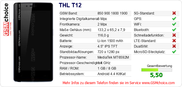 Hast du eigene Webseite? Willst du die Informationen über Standarddaten des Handys THL T12 irgendwo veröffentlichen? Das ist sehr einfach. Du kannst das Bild herunterladen oder kopieren und auf der Webseite folgenden Code hinzufügen:Das Einfügen von diesem Code verursacht das Anzeigen von dem folgenden Bild: