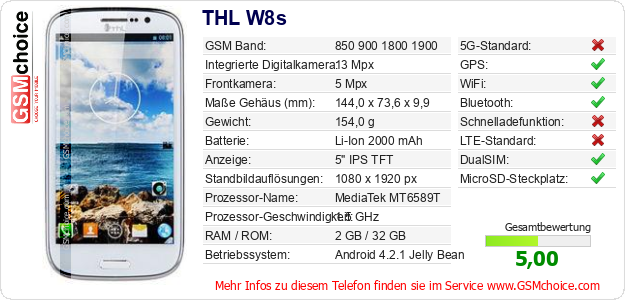 Hast du eigene Webseite? Willst du die Informationen über Standarddaten des Handys THL W8s irgendwo veröffentlichen? Das ist sehr einfach. Du kannst das Bild herunterladen oder kopieren und auf der Webseite folgenden Code hinzufügen:Das Einfügen von diesem Code verursacht das Anzeigen von dem folgenden Bild: