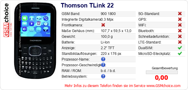 Hast du eigene Webseite? Willst du die Informationen über Standarddaten des Handys Thomson TLink 22 irgendwo veröffentlichen? Das ist sehr einfach. Du kannst das Bild herunterladen oder kopieren und auf der Webseite folgenden Code hinzufügen:Das Einfügen von diesem Code verursacht das Anzeigen von dem folgenden Bild:
