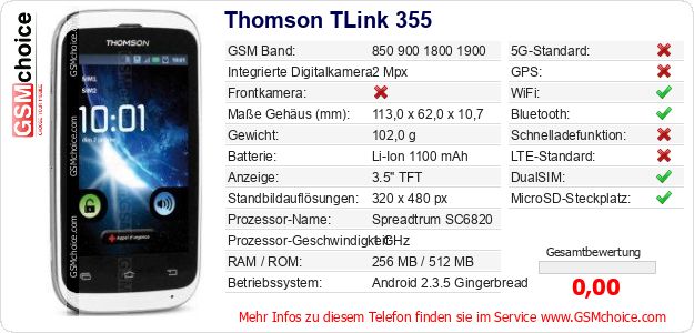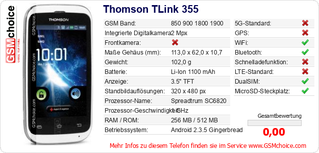 Hast du eigene Webseite? Willst du die Informationen über Standarddaten des Handys Thomson TLink 355 irgendwo veröffentlichen? Das ist sehr einfach. Du kannst das Bild herunterladen oder kopieren und auf der Webseite folgenden Code hinzufügen:Das Einfügen von diesem Code verursacht das Anzeigen von dem folgenden Bild: