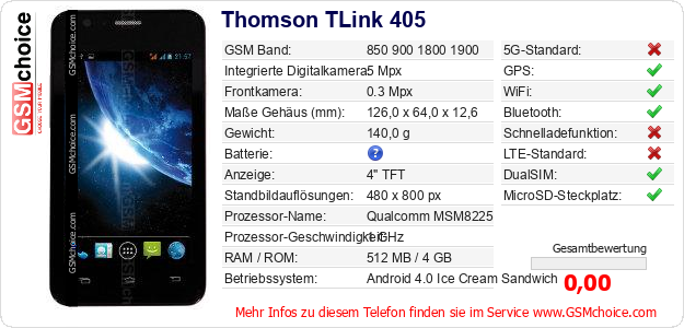 Hast du eigene Webseite? Willst du die Informationen über Standarddaten des Handys Thomson TLink 405 irgendwo veröffentlichen? Das ist sehr einfach. Du kannst das Bild herunterladen oder kopieren und auf der Webseite folgenden Code hinzufügen:Das Einfügen von diesem Code verursacht das Anzeigen von dem folgenden Bild: