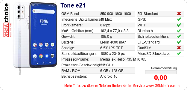 Hast du eigene Webseite? Willst du die Informationen über Standarddaten des Handys Tone e21 irgendwo veröffentlichen? Das ist sehr einfach. Du kannst das Bild herunterladen oder kopieren und auf der Webseite folgenden Code hinzufügen:Das Einfügen von diesem Code verursacht das Anzeigen von dem folgenden Bild: