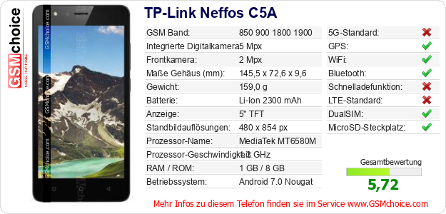 Hast du eigene Webseite? Willst du die Informationen über Standarddaten des Handys TP-Link Neffos C5A irgendwo veröffentlichen? Das ist sehr einfach. Du kannst das Bild herunterladen oder kopieren und auf der Webseite folgenden Code hinzufügen:Das Einfügen von diesem Code verursacht das Anzeigen von dem folgenden Bild: