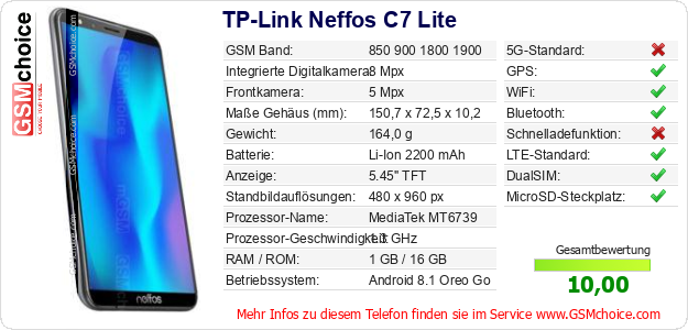 Hast du eigene Webseite? Willst du die Informationen über Standarddaten des Handys TP-Link Neffos C7 Lite irgendwo veröffentlichen? Das ist sehr einfach. Du kannst das Bild herunterladen oder kopieren und auf der Webseite folgenden Code hinzufügen:Das Einfügen von diesem Code verursacht das Anzeigen von dem folgenden Bild: