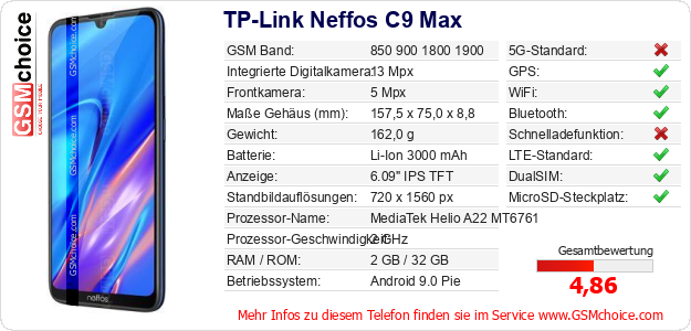 Hast du eigene Webseite? Willst du die Informationen über Standarddaten des Handys TP-Link Neffos C9 Max irgendwo veröffentlichen? Das ist sehr einfach. Du kannst das Bild herunterladen oder kopieren und auf der Webseite folgenden Code hinzufügen:Das Einfügen von diesem Code verursacht das Anzeigen von dem folgenden Bild: