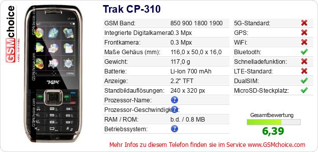 Hast du eigene Webseite? Willst du die Informationen über Standarddaten des Handys Trak CP-310 irgendwo veröffentlichen? Das ist sehr einfach. Du kannst das Bild herunterladen oder kopieren und auf der Webseite folgenden Code hinzufügen:Das Einfügen von diesem Code verursacht das Anzeigen von dem folgenden Bild: