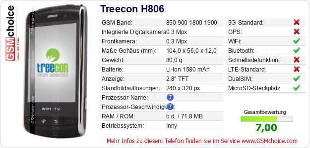 Hast du eigene Webseite? Willst du die Informationen über Standarddaten des Handys Treecon H806 irgendwo veröffentlichen? Das ist sehr einfach. Du kannst das Bild herunterladen oder kopieren und auf der Webseite folgenden Code hinzufügen:Das Einfügen von diesem Code verursacht das Anzeigen von dem folgenden Bild: